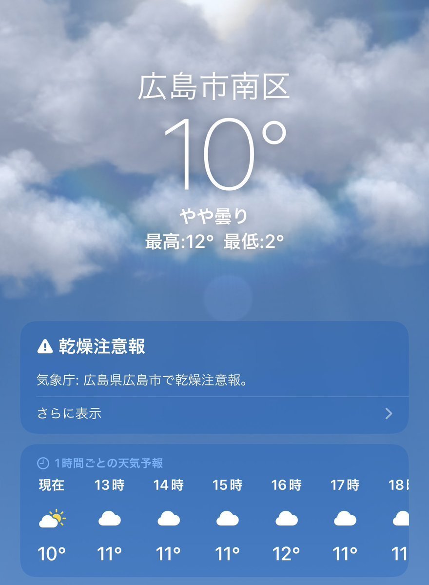 なかなかパッと晴れる事がない広島ですね😓ただ、乾燥注意報が出ています⚠️火事のニュースが多いのでくれぐれもご注意ください💦