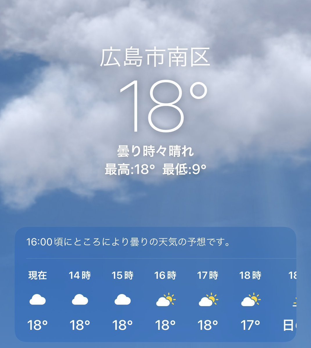 3/12(土)広島市南区の天気は晴れ‼️なんと現在18°だそうです😲