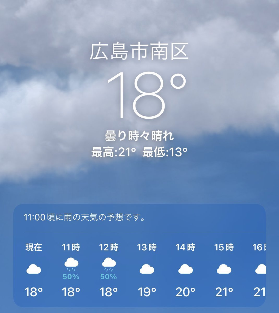 5/15(日)広島市南区天気は曇り☁️雨が降らという予報です💦傘のご準備をー。
