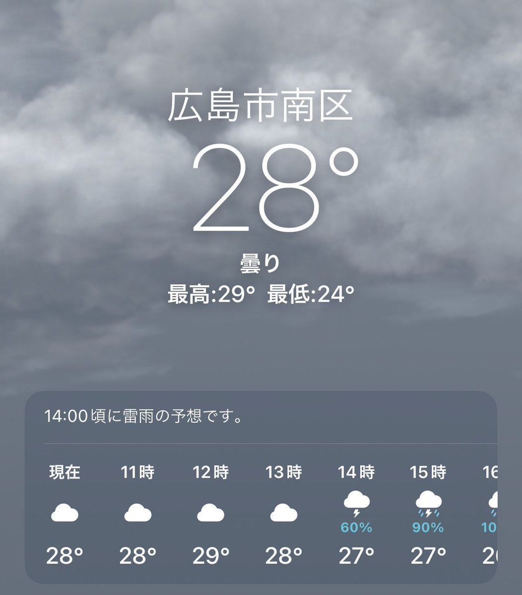 6/24(金)広島市南区の天気は曇りで午後からは雨予報との事です💦お出かけの皆様は傘をお忘れなく👍