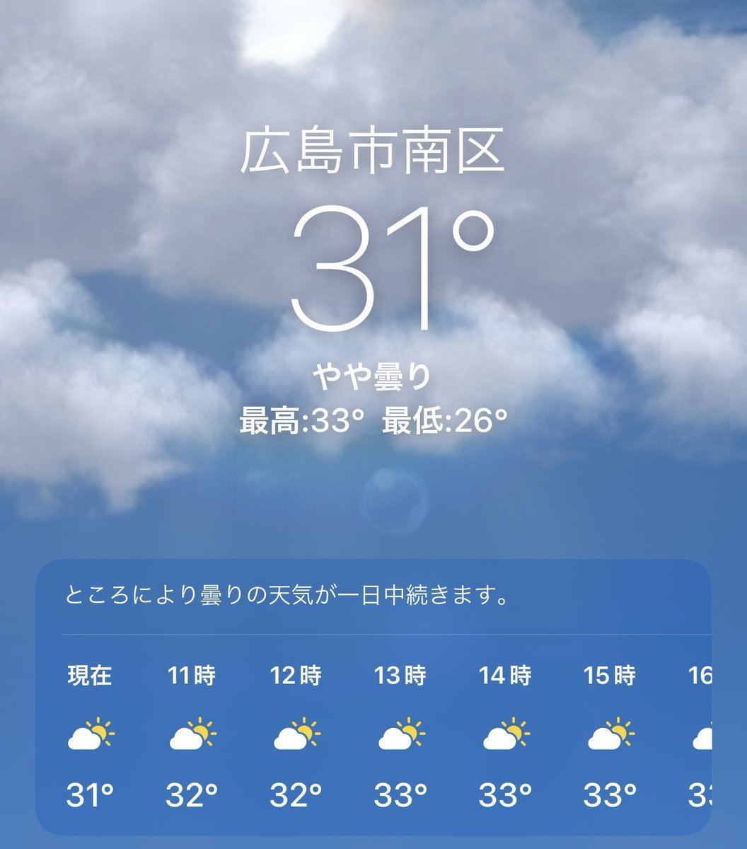 7/28(木)広島市南区の天気は晴れ☀️すでにかなり暑いですが本当にいいお天気(*´ω`*)こんな日は、思いっきり汗をかける格好でスポーツとかやったら気持ち良さそうです(運動神経悪いんですけどねw)