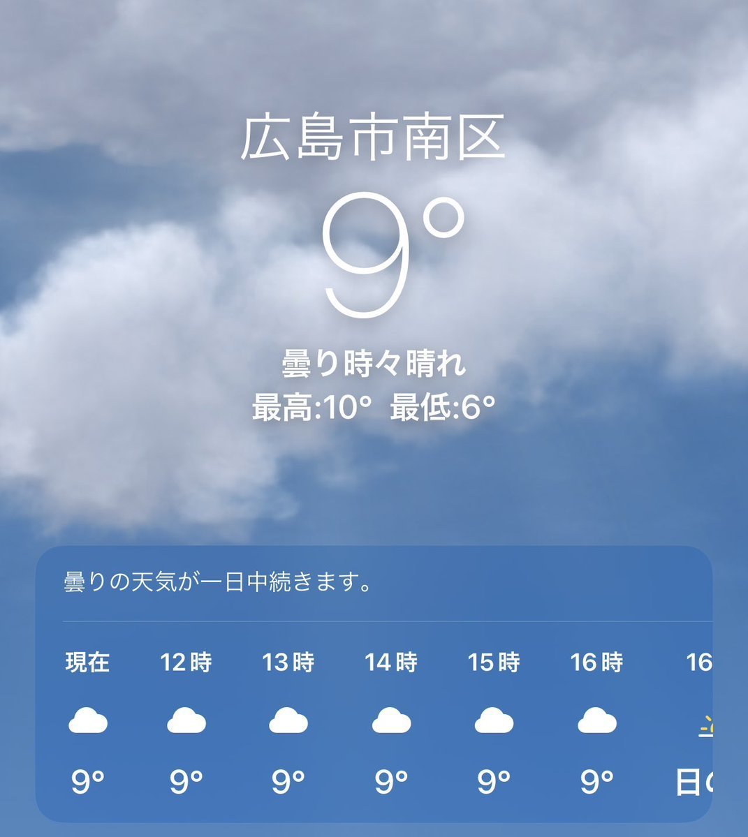 12/1(木)広島市南区の天気は曇り☁️寒いと思ったら気温9°ですか🥶皆さん風邪ひかないでくださいねー😂
