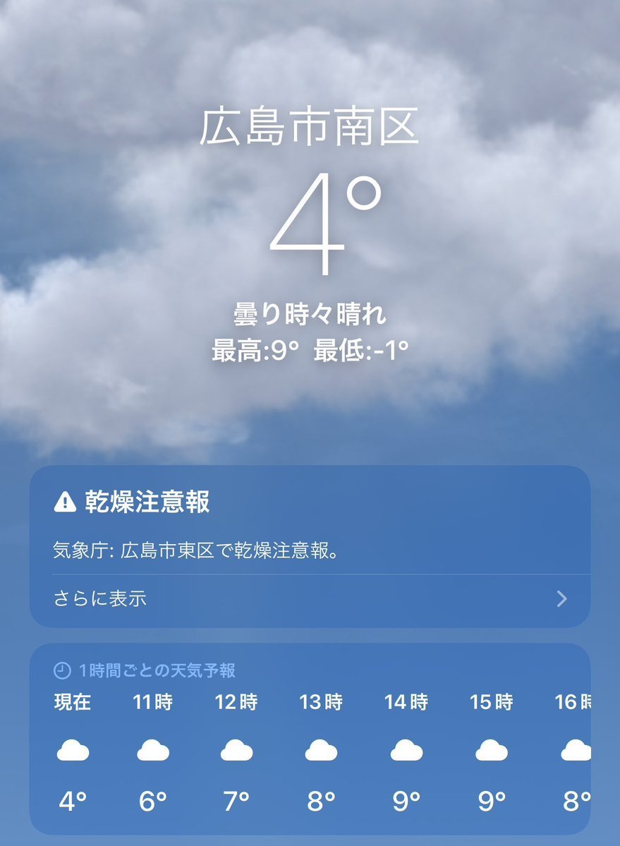 1/22(日)広島市南区の天気は曇り☁️そして、大寒波と言われているだけあって寒いです😵久しぶりに最低気温がマイナスです💦